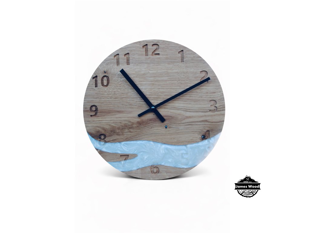 Naše hodiny jsou vyráběny s ohledem na kvalitu a pečlivost. Tyto hodiny na obrázku jsou zhotovené z Dubového dřeva, které má unikátní kresbu. Hlavní dominantou těchto hodin je pryskyřicová řeka, která je vylita uměleckým způsobem a může být laděna do jakékoliv barvy podle vašeho přání. Každé dřevo je pečlivě opracováno a natřeno zdravý nezávadným olejem od značky OSMO, který je vhodný i pro styk s potravinami.
