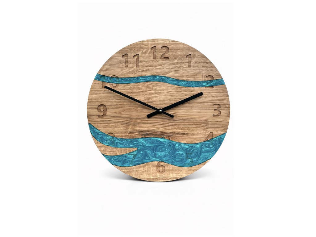 Naše hodiny jsou vyráběny s ohledem na kvalitu a pečlivost. Tyto hodiny na obrázku jsou zhotovené z Dubového dřeva, které má unikátní kresbu. Hlavní dominantou těchto hodin je pryskyřicová řeka, která je vylita uměleckým způsobem a může být laděna do jakékoliv barvy podle vašeho přání. Každé dřevo je pečlivě opracováno a natřeno zdravý nezávadným olejem od značky OSMO, který je vhodný i pro styk s potravinami.