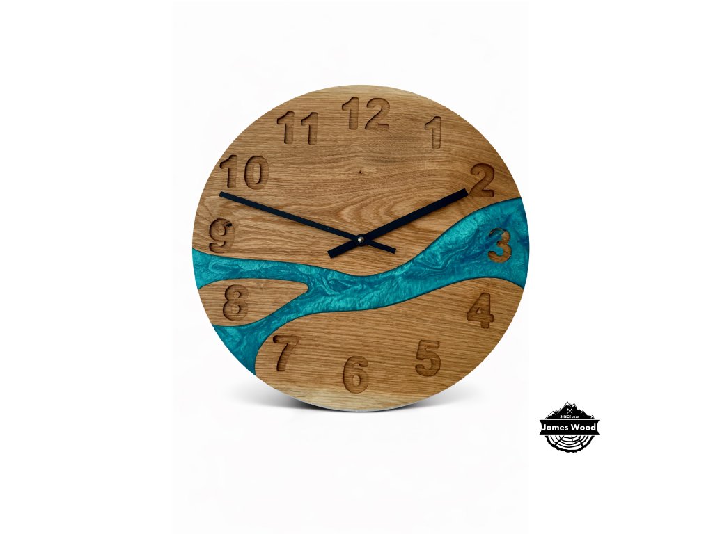 Naše hodiny jsou vyráběny s ohledem na kvalitu a pečlivost. Tyto hodiny na obrázku jsou zhotovené z Dubového dřeva, které má unikátní kresbu. Hlavní dominantou těchto hodin je pryskyřicová řeka, která je vylita uměleckým způsobem a může být laděna do jakékoliv barvy podle vašeho přání. Každé dřevo je pečlivě opracováno a natřeno zdravý nezávadným olejem od značky OSMO, který je vhodný i pro styk s potravinami.
