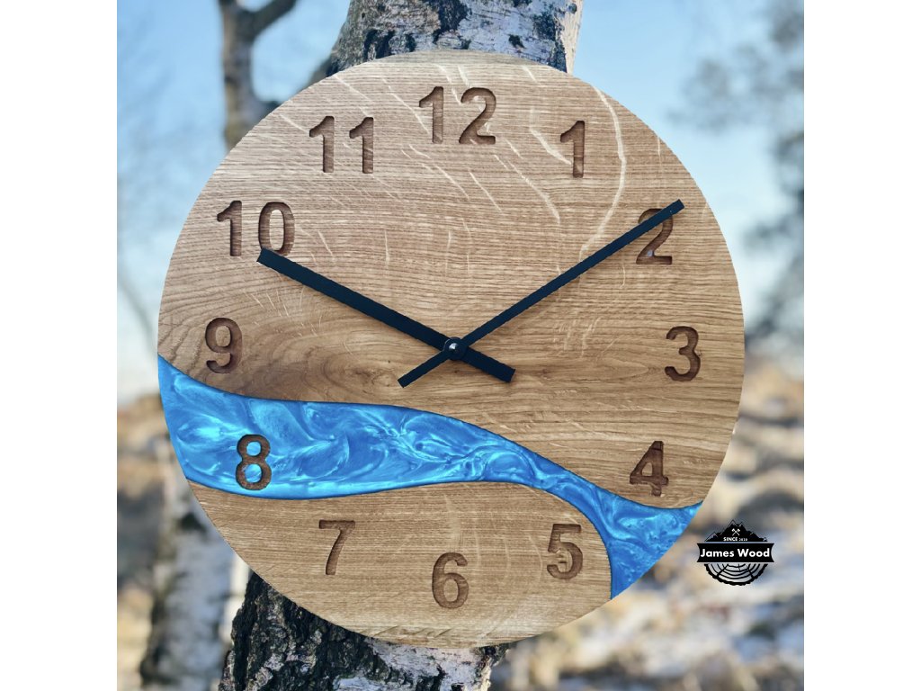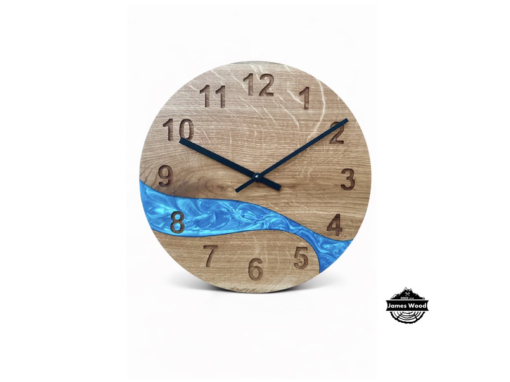 Naše hodiny jsou vyráběny s ohledem na kvalitu a pečlivost. Tyto hodiny na obrázku jsou zhotovené z Dubového dřeva, které má unikátní kresbu. Hlavní dominantou těchto hodin je pryskyřicová řeka, která je vylita uměleckým způsobem a může být laděna do jakékoliv barvy podle vašeho přání. Každé dřevo je pečlivě opracováno a natřeno zdravý nezávadným olejem od značky OSMO, který je vhodný i pro styk s potravinami.