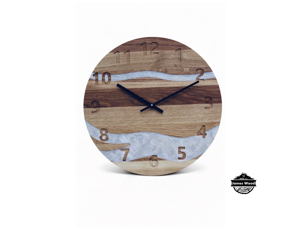 Hodiny jsou vyráběny ručně, proto jsou naše díla velmi povedená a kvalitní. Hodiny na obrázku jsou vyrobené z Dubového dřeva. Toto dřevo má velmi specifickou kresbu. Dále tento typ hodin může být vyroben z ořechového dřeva, jasanového nebo dřeva bukového. Obrazec je vylitý epoxidovou pryskyřicí, která může být laděná do jakékoliv barvy. Dřevo je opracováno a natřeno olejem od značky OSMO, který je zdravý nezávadný a je určený i pro styk s potravinami.