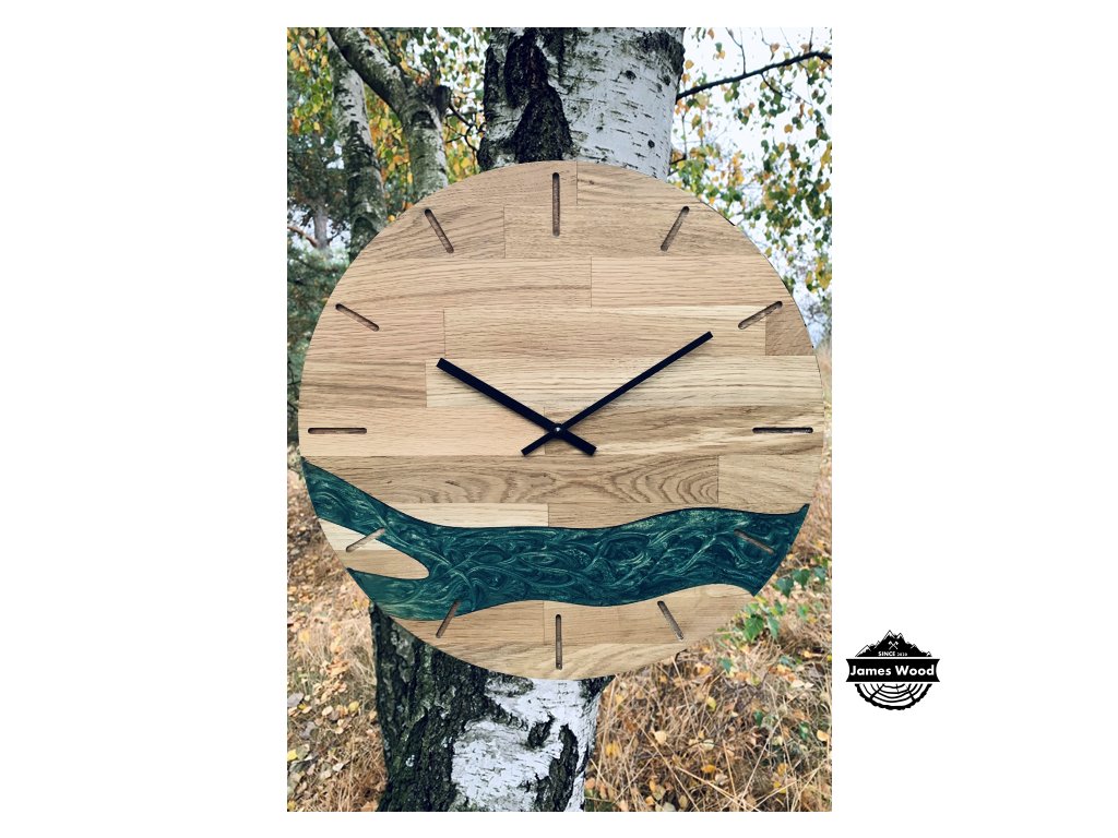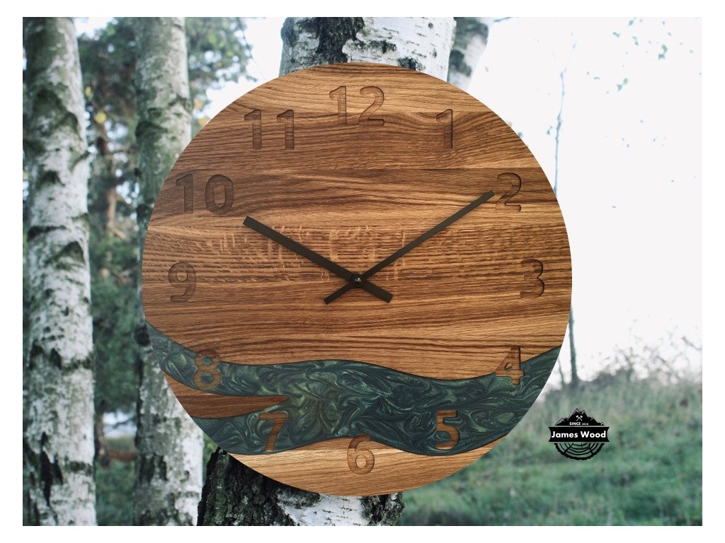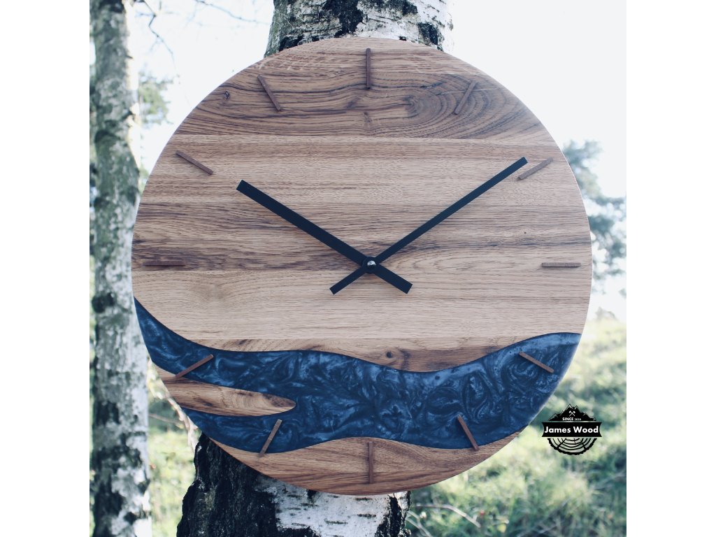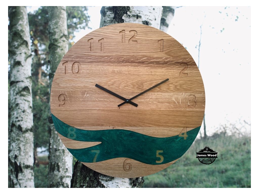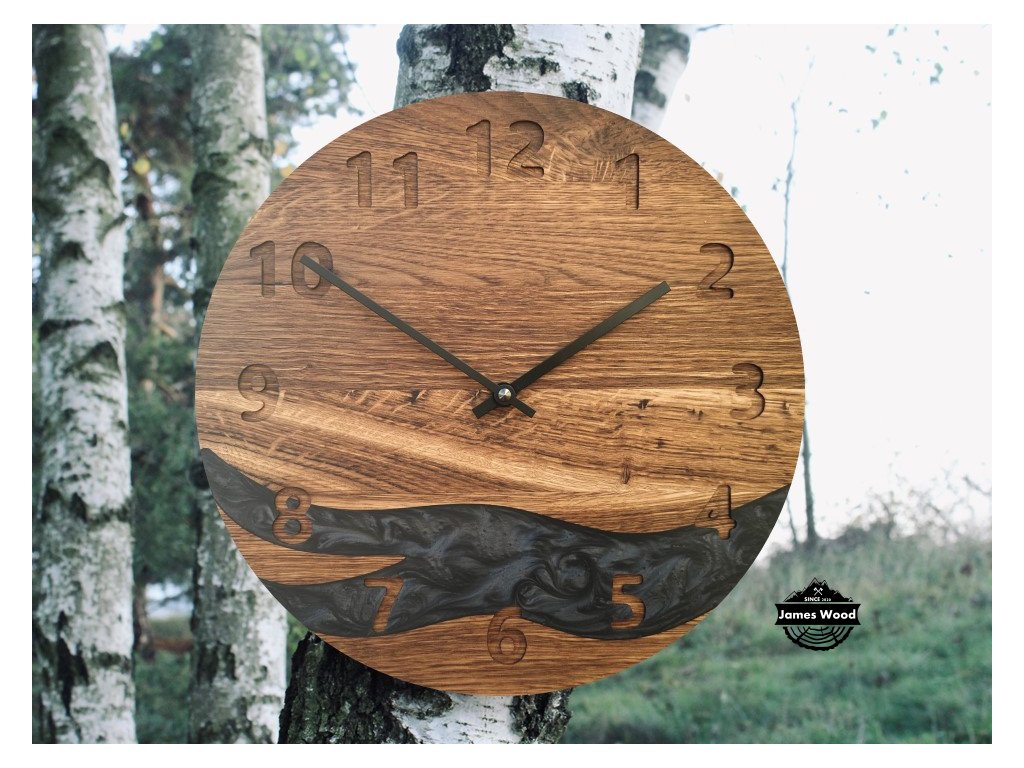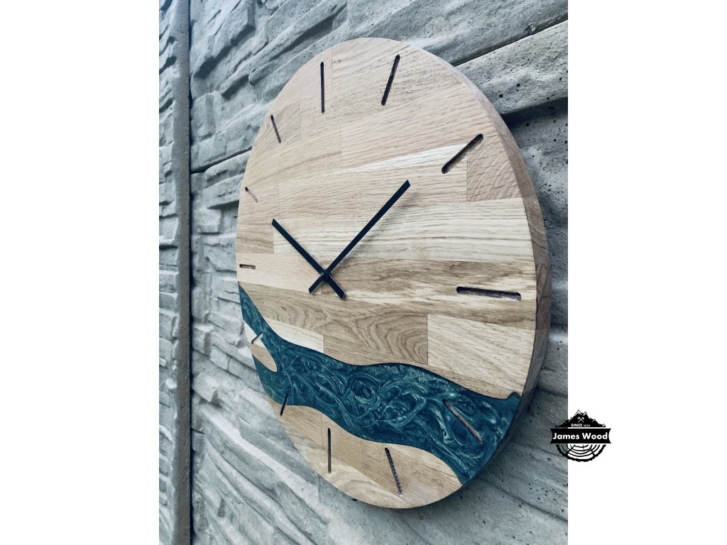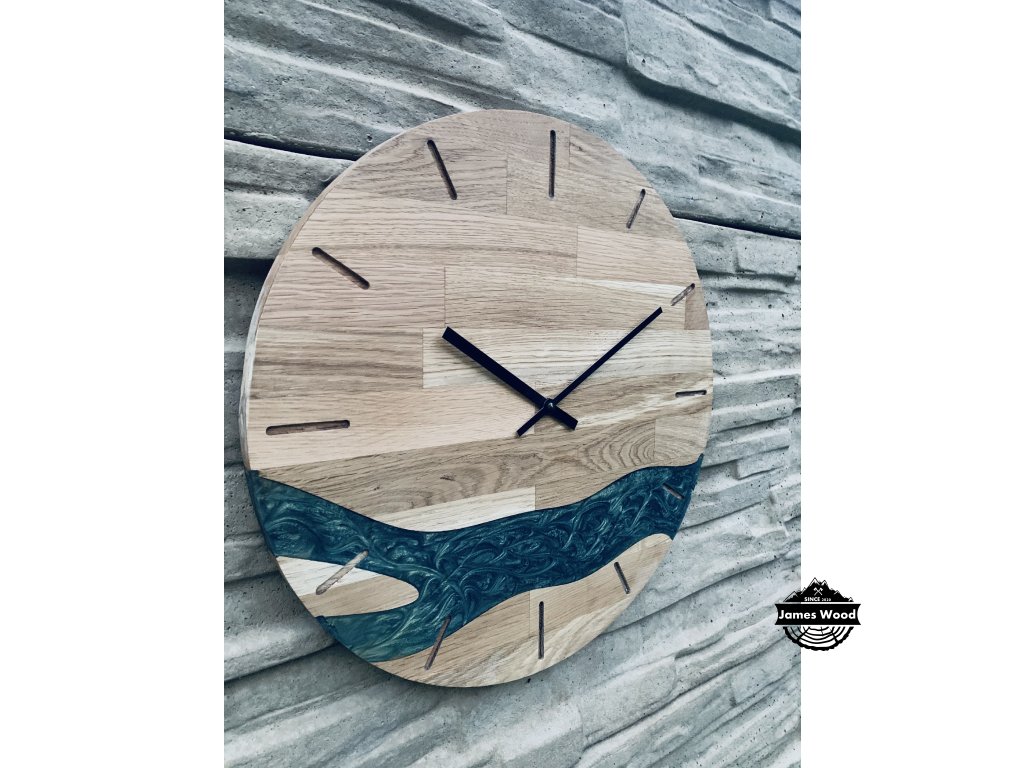 Hodiny jsou vyráběny ručně, proto jsou naše díla velmi povedená a kvalitní. Hodiny na obrázku jsou vyrobené z Dubového dřeva. Toto dřevo má velmi specifickou kresbu. Dále tento typ hodin může být vyroben z ořechového dřeva, jasanového nebo dřeva bukového. Obrazec je vylitý epoxidovou pryskyřicí, která může být laděná do jakékoliv barvy. Dřevo je opracováno a natřeno olejem od značky OSMO, který je zdravý nezávadný a je určený i pro styk s potravinami.