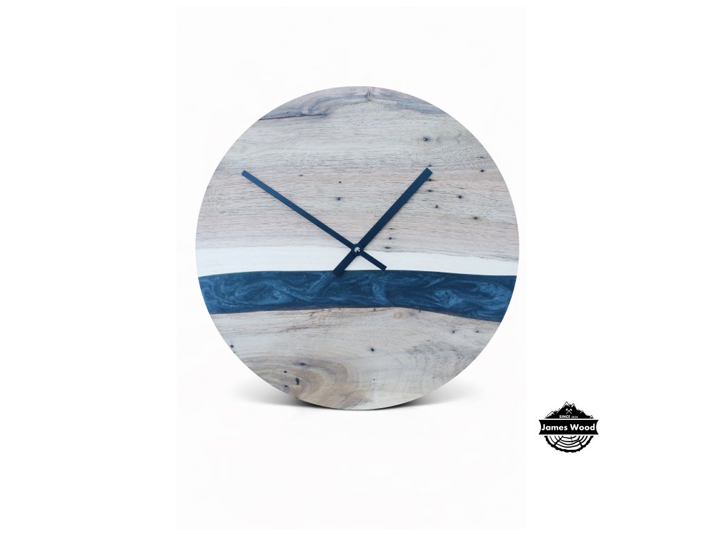 Hodiny z evropského ořechu, u kterých vyniká černošedá řeka z pryskyřice, která je krásně zapuštěná do dřeva.
